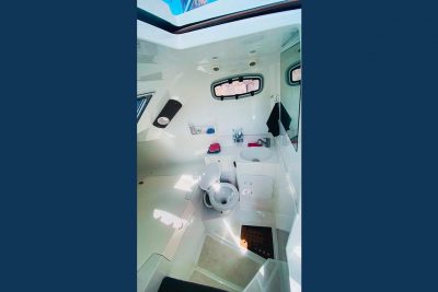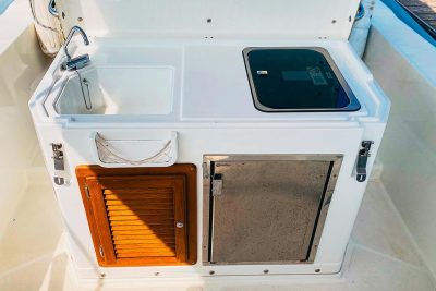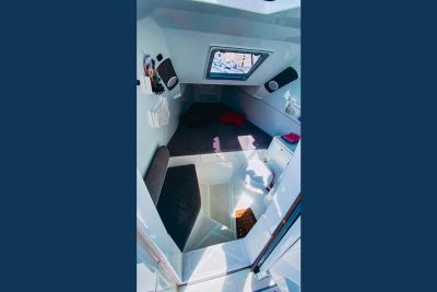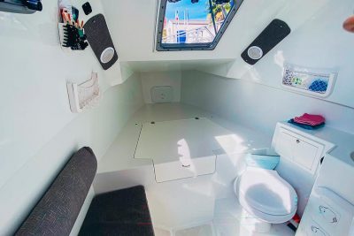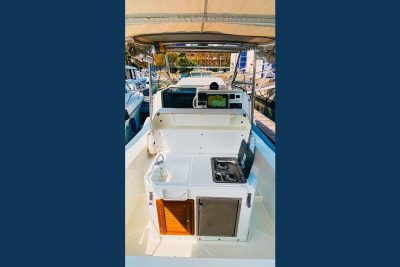 It has a double berth and a cockpit convertible to a large sun pad. Under the helm seat, there is a gas stove, a sink, and a refrigerator, providing everything necessary for living on board.
