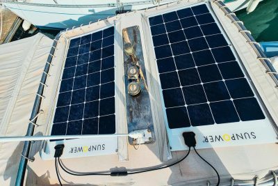 In addition, two 110 W solar panels, coupled with a Victron inverter installed in 2023, ensure energy autonomy.
