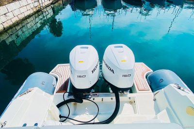 The boat is equipped with two Honda BF 150 DXDV from 2022 totaling 369 hours, still under manufacturer's warranty until 2032, and equipped with a bow thruster.