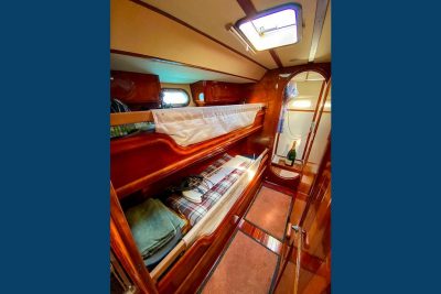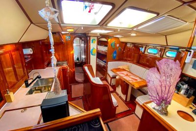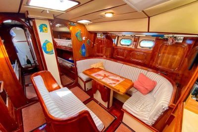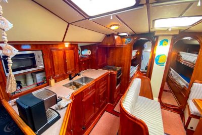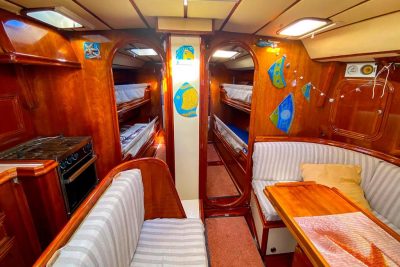 L’aménagement intérieur est résolument tourné vers la vie à bord au long cours et parfaitement adaptés aux navigations prolongées. Les volumes sont intelligemment répartis avec 4 cabines doubles, permettant d’accueillir confortablement famille et équipage : 2 cabines à l'arrière avec lits doubles, spacieuses et lumineuses dont une avec ses toilettes indépendants, et 2 cabines à l'avant avec deux bannettes simples superposées, idéales pour équipiers ou enfants, avec une salle de bain commune. L'intérieur du bateau est habillé de magnifiques menuiseries en merisier réalisées sur mesure. Le carré, chaleureux et fonctionnel, offre un véritable espace de vie, protégé et convivial, quelles que soient les conditions. La cuisine équipée est parfaitement fonctionnelle avec un plan de travail spacieux et des espaces de rangement généreux. Côté technique, tout a été pensé dans les moindres détails pour assurer la sécurité et le confort de son équipage.
