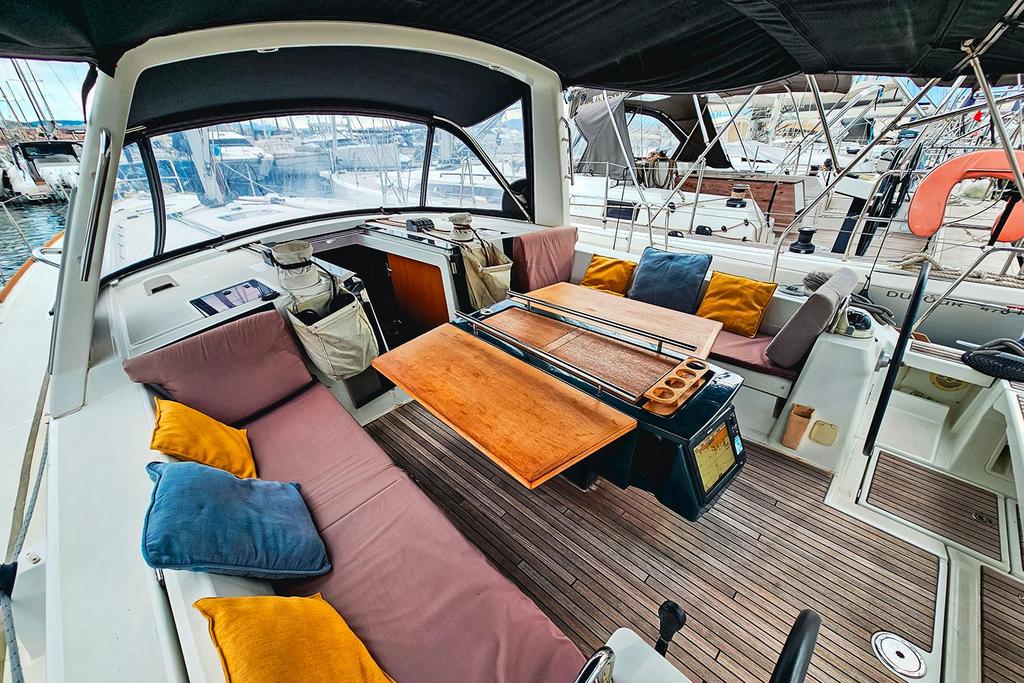 Le cockpit est particulièrement agréable, protégé par un large bimini et équipé de matelas sur les assises. La jupe électrique complète ingénieusement cet espace : en position haute, elle forme une grande assise accueillante et sécurise parfaitement le cockpit en navigation ; en position basse, elle agrandit l’espace extérieur et s’ouvre sur la mer. Les vérins électriques ont été remplacés en 2023, et une télécommande permet de relever la jupe à distance pour avoir l'esprit serein lors des escales à terre.