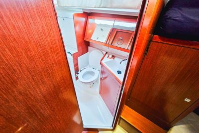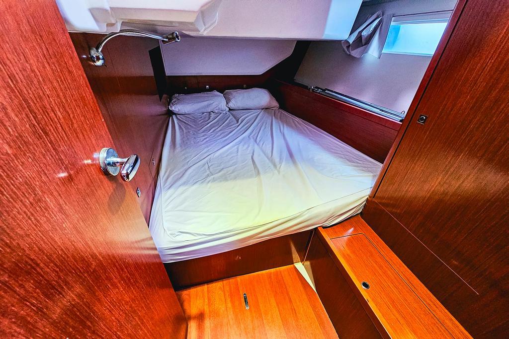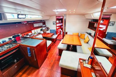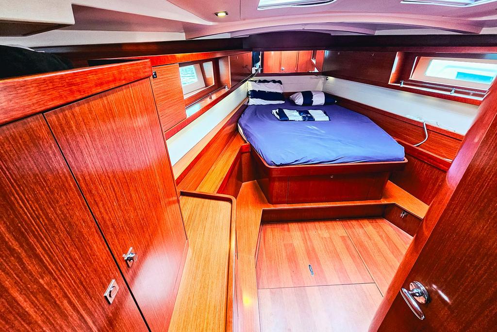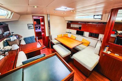 Ce voilier de propriétaire est proposé en version trois cabines et deux salles de bain, avec un carré convertible en lit double.