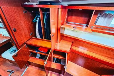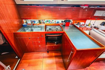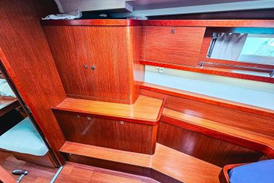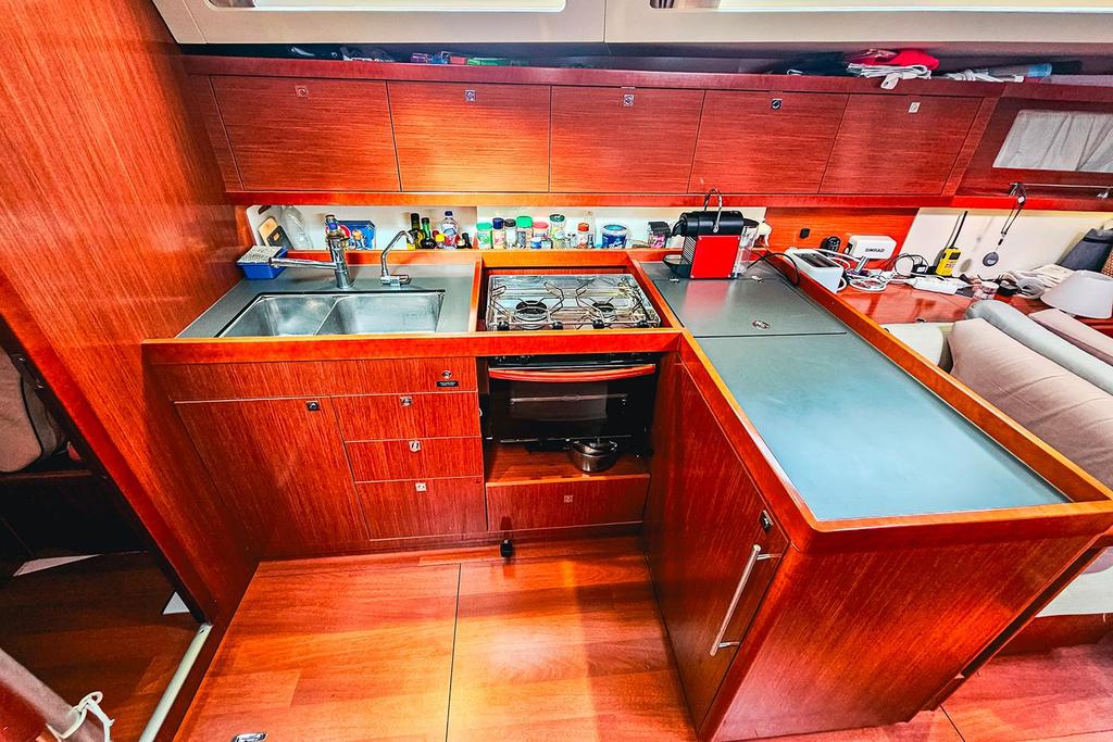 Les rangements extérieurs sont nombreux, avec de grands coffres profonds dans le cockpit ainsi qu’une soute à voile à l’avant. À l’intérieur, on trouve une cuisine spacieuse équipée de deux réfrigérateurs totalisant 210 litres, ainsi que de multiples espaces de rangement dans le carré et les cabines.