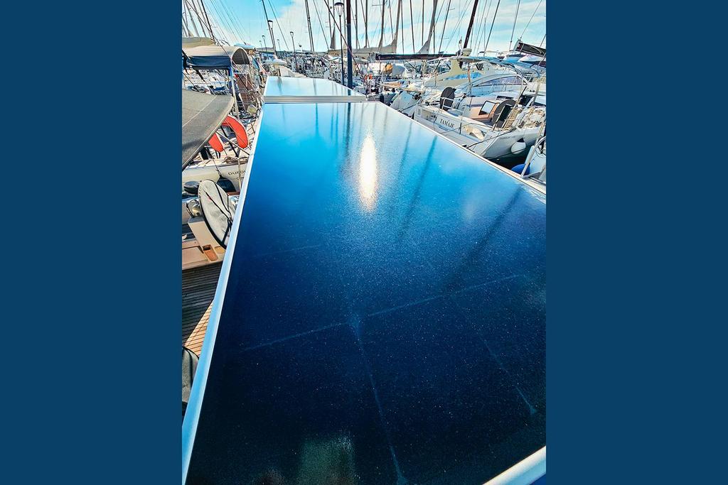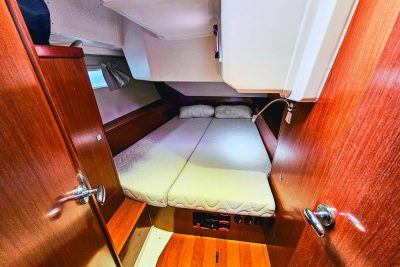 Le bateau dispose d’un bossoir d’annexe en inox installé en 2023, portant deux panneaux solaires de 200 W chacun qui garantissent une excellente autonomie électrique en croisière. Il est également doté de quatre batteries de servitude et la pompe de cale a été remplacée en 2025.