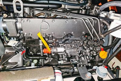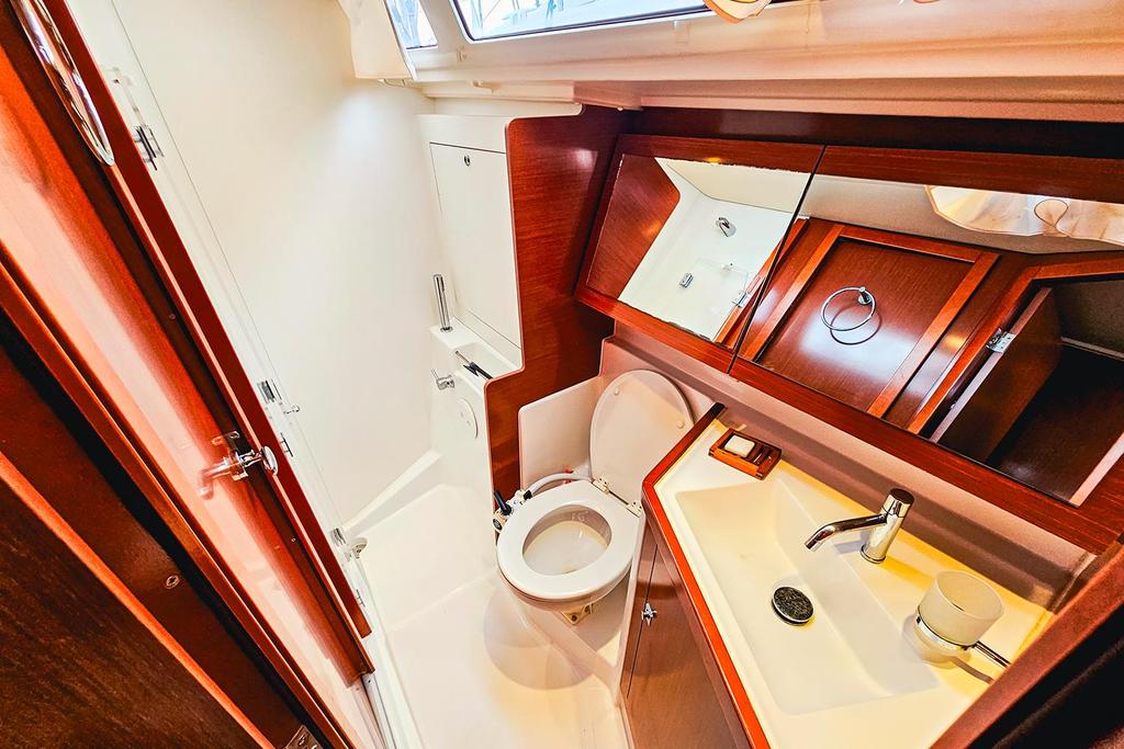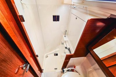 Il est équipé d’une grand-voile sur enrouleur de mât et d’un génois à grand recouvrement, manoeuvrables grâce à quatre winchs dont un électrique dédié à la GV. Côté motorisation, on retrouve un Yanmar de 54 ch en saildrive, un moteur coupleux à bas régime et silencieux.