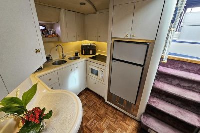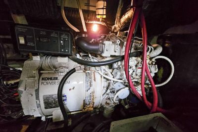 L’équipement est complet avec un générateur Kohler, une passerelle hydraulique, un propulseur d’étrave pour faciliter les manœuvres, ainsi qu’un guindeau électrique.