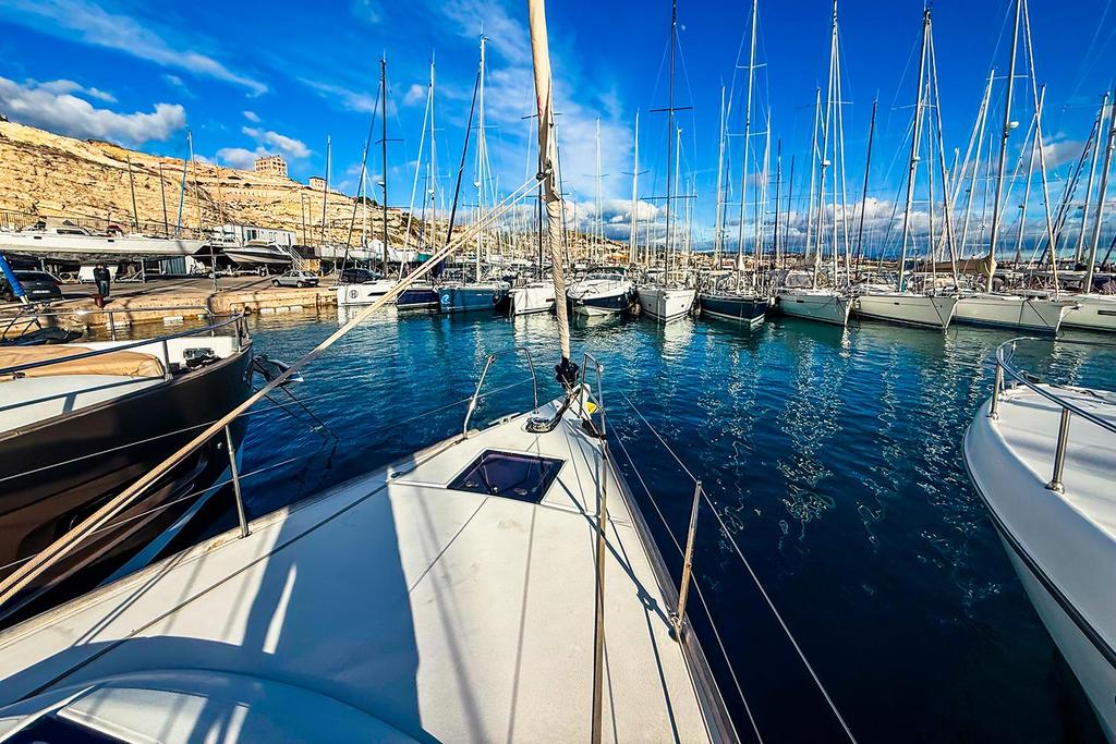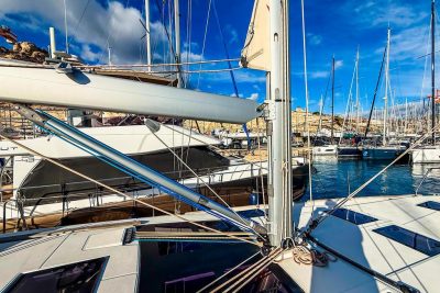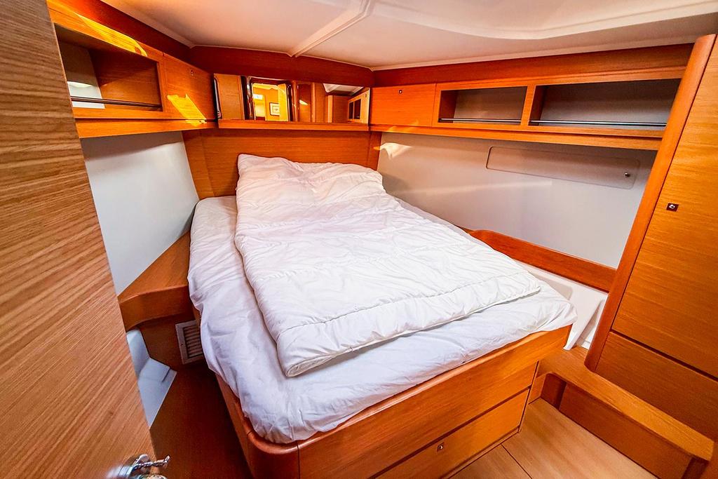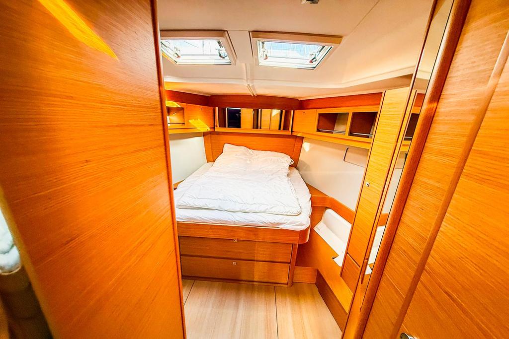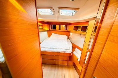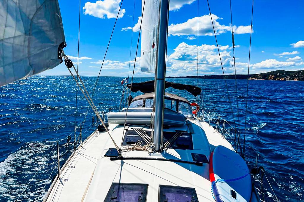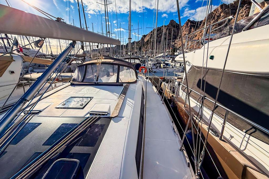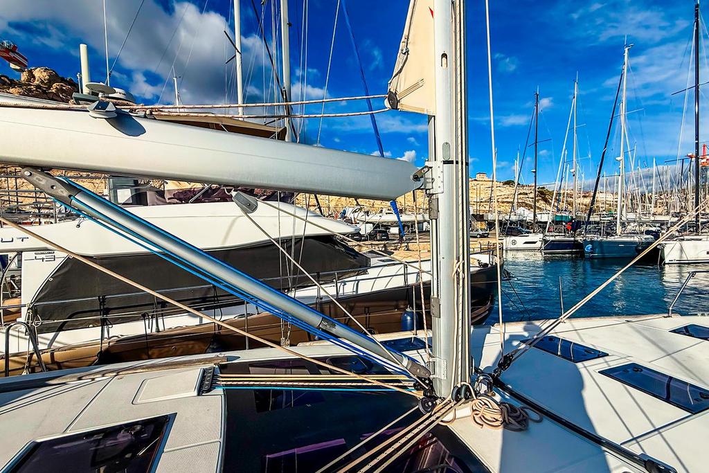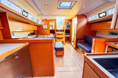 Motorisation Volvo Penta D2 75 CV (ou 55 CV standard), voilure performante (GV 49,5 m², génois 46,5 m²), quille bulbeuse et double safran pour une navigation précise et sécurisante.