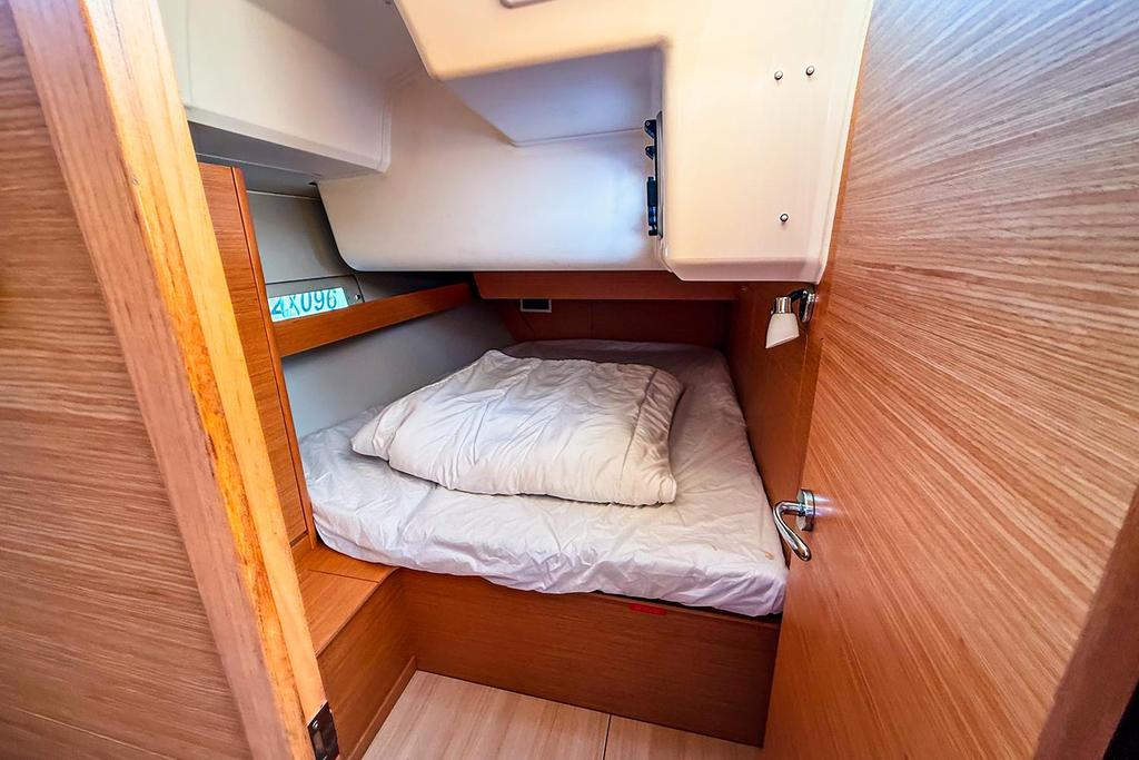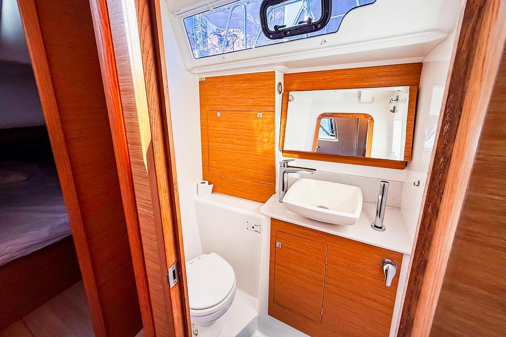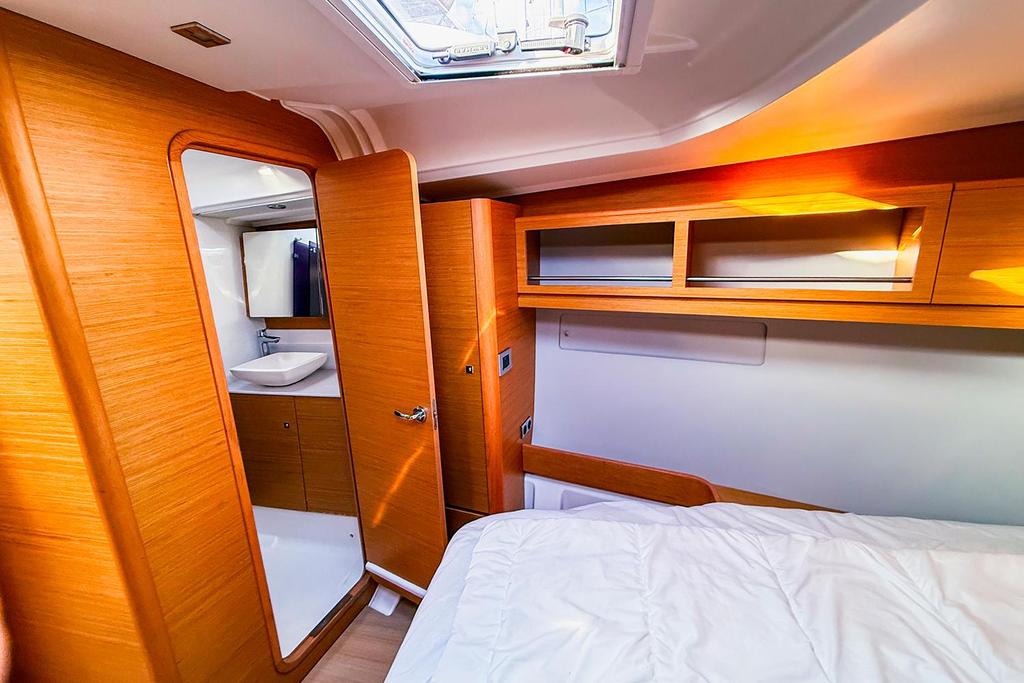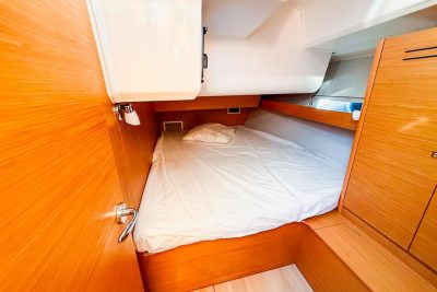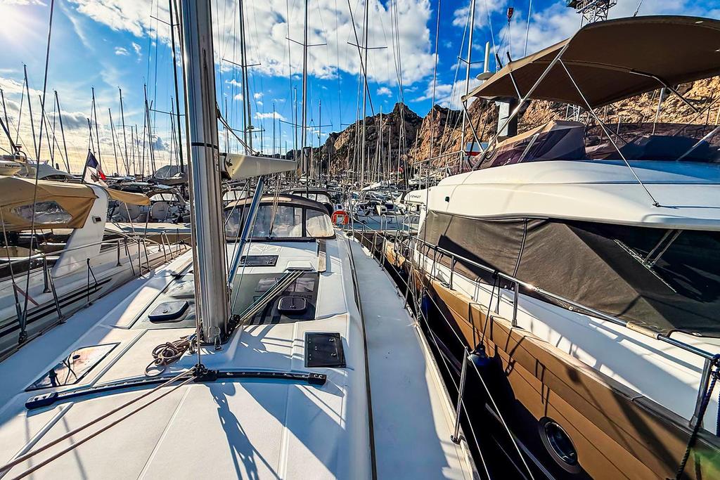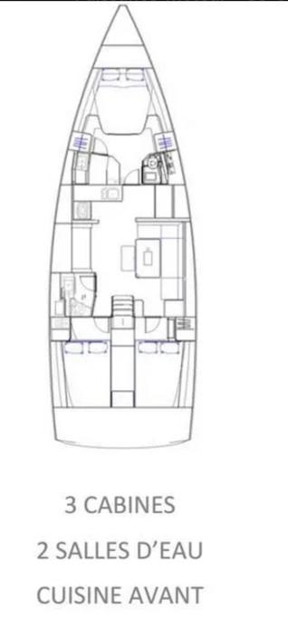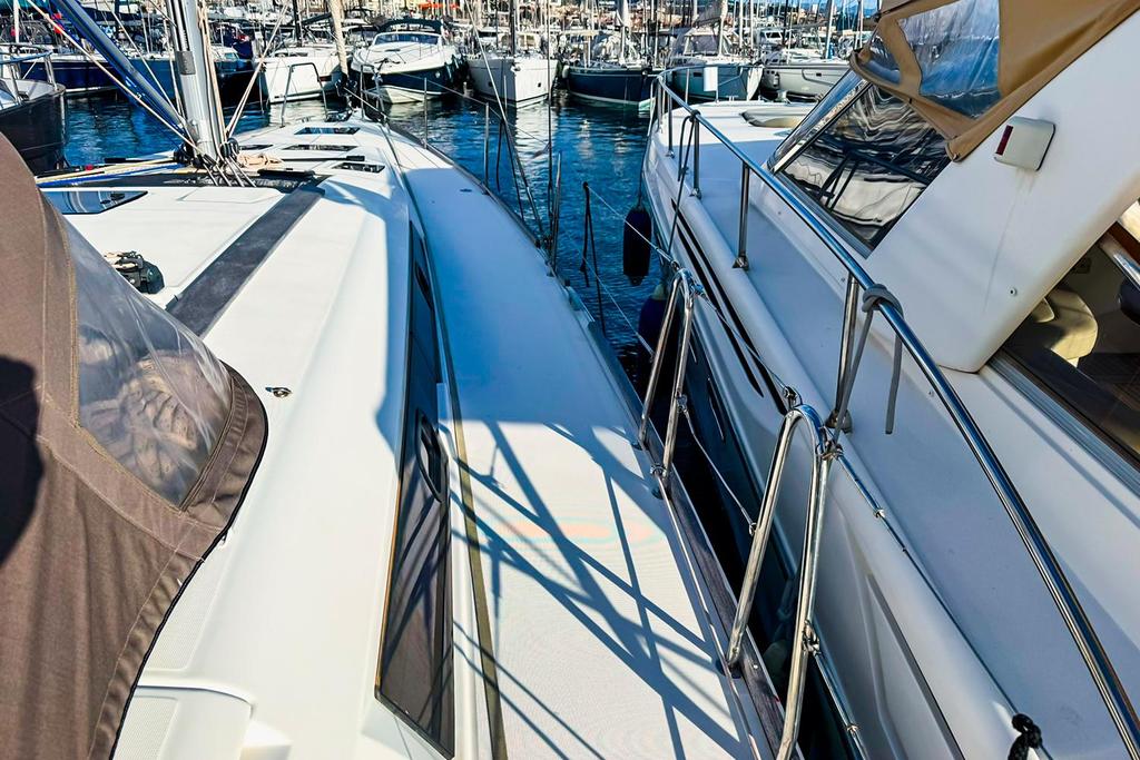 L'aménagement intérieur offre 8 couchages avec 3 cabines doubles, 2 salles d'eau, carré lumineux et cuisine en long équipée. Réservoirs généreux : 530 L d'eau douce et 250 L de carburant pour une autonomie optimale.