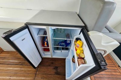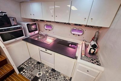 L’électronique de bord est parfaitement fonctionnelle. Le frigo extérieur Isotherm est neuf. Le taud d’hivernage, récemment remplacé, permet de profiter du bateau toute l’année.