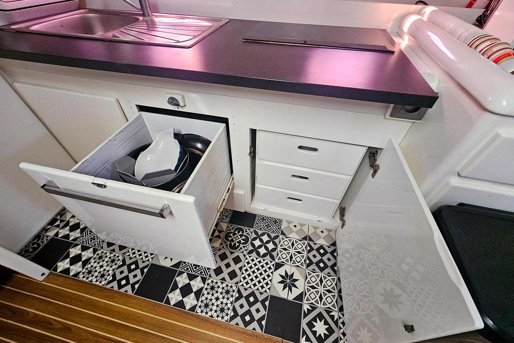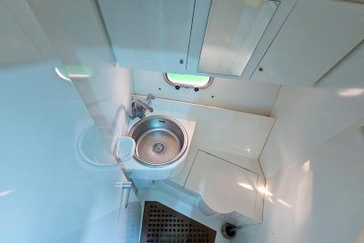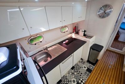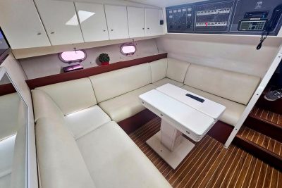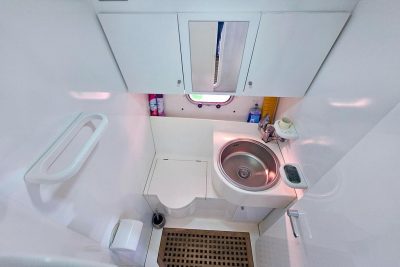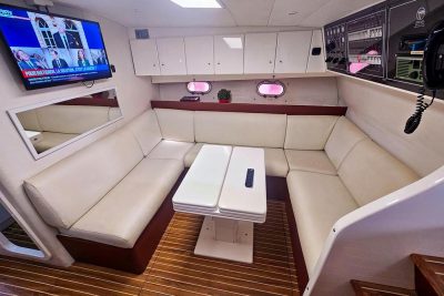 Son agencement comprend trois cabines et trois salles d’eau, idéal pour des croisières en famille ou entre amis. Les volumes intérieurs sont généreux, la circulation à bord est fluide et la luminosité très agréable.