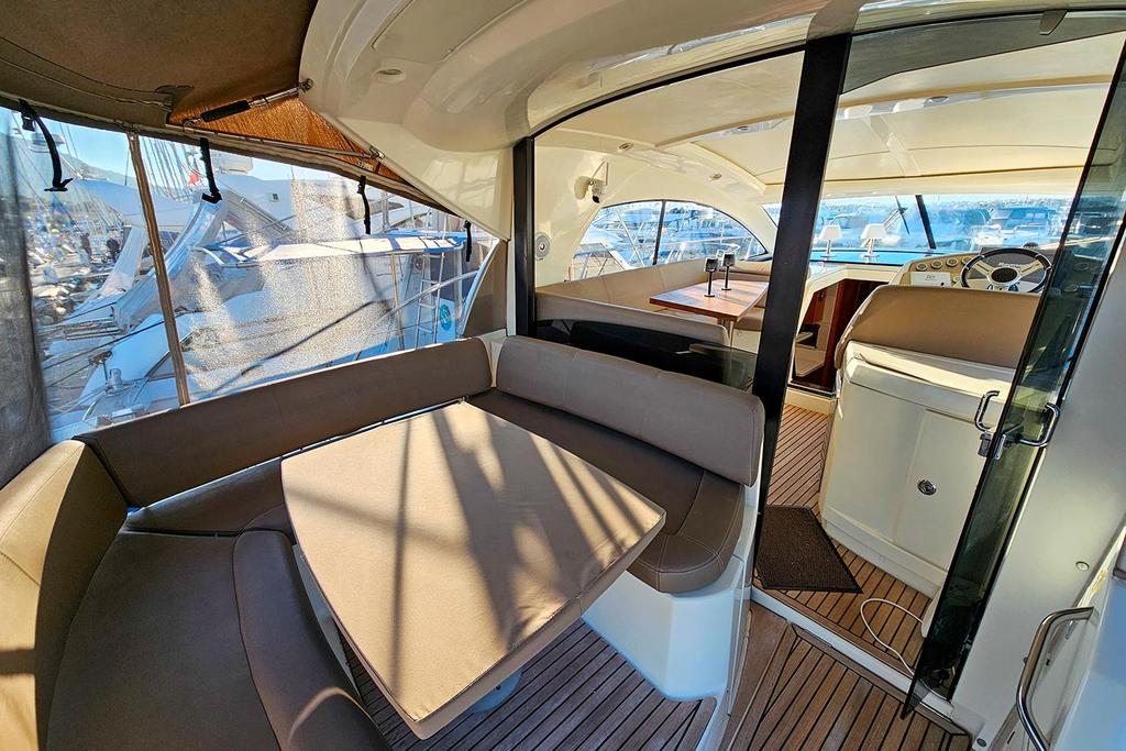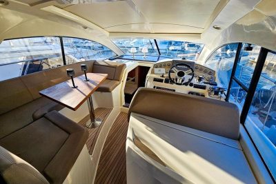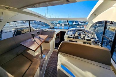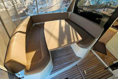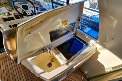 Le cockpit offre un confort optimal quelle que soit la météo. Le bateau dispose d’un vaste cockpit intérieur et extérieur. Le cockpit intérieur est équipé d’une cuisine d’été et d’un grand toit ouvrant. Il communique avec le cockpit extérieur grâce à un système électrique de vitre abaissante, permettant de décloisonner les deux espaces et d’agrandir considérablement la zone de vie. Le cockpit extérieur, quant à lui, est protégé par un taud amovible et se transforme en un grand bain de soleil.