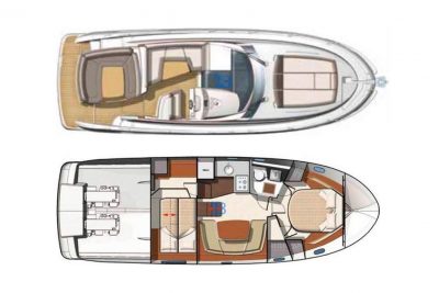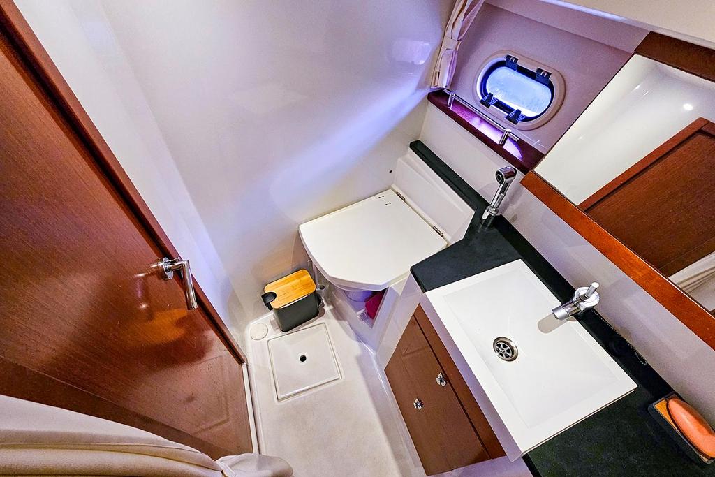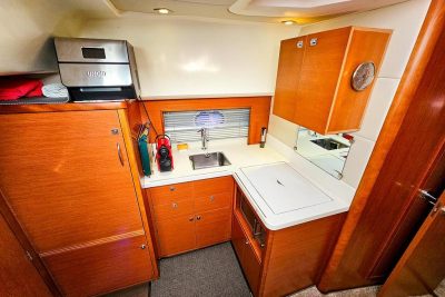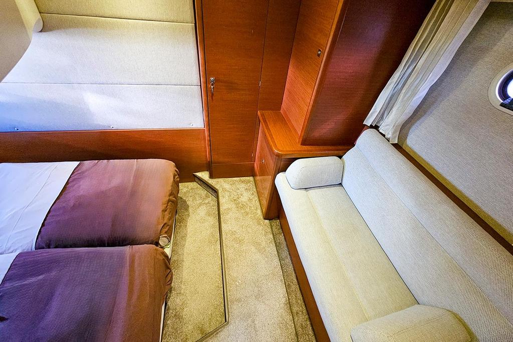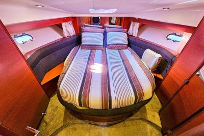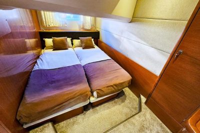 En terme d’aménagement intérieur, nous retrouvons deux cabines et une salle d’eau. La cabine propriétaire dispose d’un accès direct à la salle d’eau ainsi que d’un dressing très spacieux. Le carré comprend une cuisine entièrement équipée avec un grand réfrigérateur, ainsi qu’un coin salon convertible en couchage double.