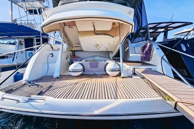 Ce modèle dispose également d’un grand garage à annexe, offrant un important volume de rangement en complément de l’annexe. Juste en dessous se trouve la salle des machines, avec un large accès aux moteurs facilitant leur entretien.