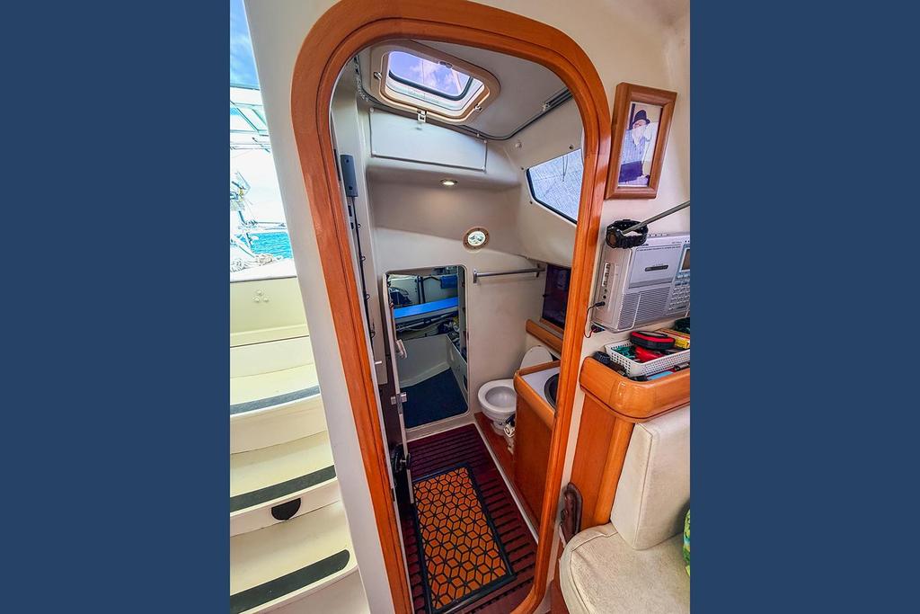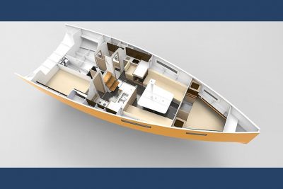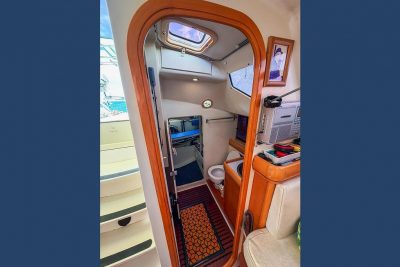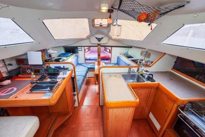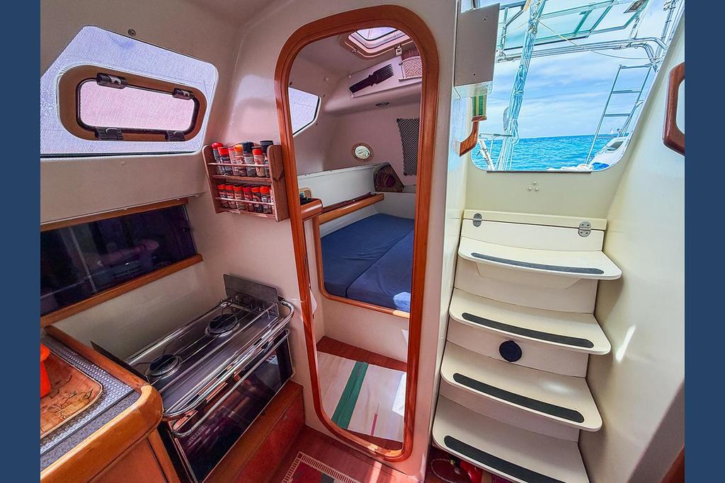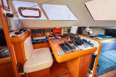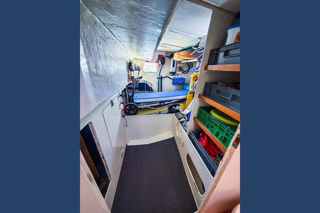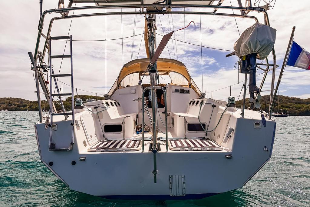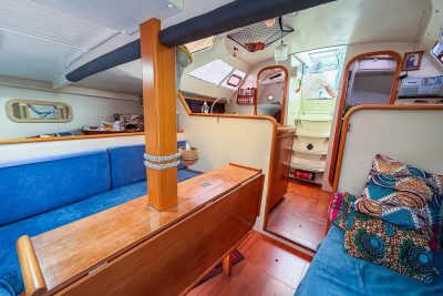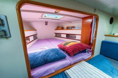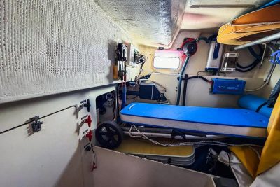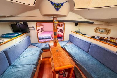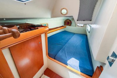 Configuration idéale en 2 cabines, avec une vraie cabine propriétaire arrière, une belle pointe avant double et trois couchages une place possibles dans le carré. À bord, un atout majeur : un local technique fortement apprécié qui rend tout accessible très facilement (moteur, système de barre et vérin du pilote automatique, batteries et appareils électriques associés). Un vrai plus en navigation comme en maintenance.