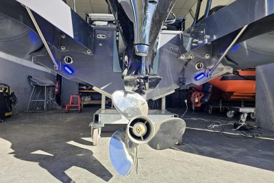 Côté équipements, le bateau dispose d’un éclairage complet, avec un spot de lumière blanche, des lumières sous-marines bleues, et une lumière rouge sous le T-top, idéale pour éviter l’éblouissement de nuit. Un support Minn Kota sur mesure et très robuste est installé à l’avant, en plus d'une connectique étanche prévue pour l’utilisation d’un broyeur à sardines ou d’un treuil grande profondeur. Le bateau est équipé de 4 porte-cannes, d’une pompe de lavage à eau de mer, d’une ancre avec 50 mètres de corde, ainsi que d’un roll-bar intégrant les feux de navigation et un point d’accroche pour les activités nautiques.